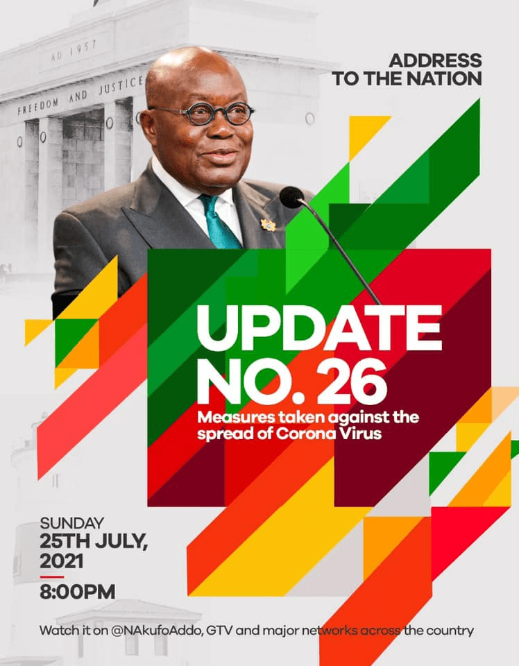 The rise of the Covid-19 cases in the country is high. President, Nana Addo Dankwa Akuffo-Addo, the first gentleman of the state gave a speech on Sunday 25th July 2021 concerning the state of events as far Covid-19 is concerned.