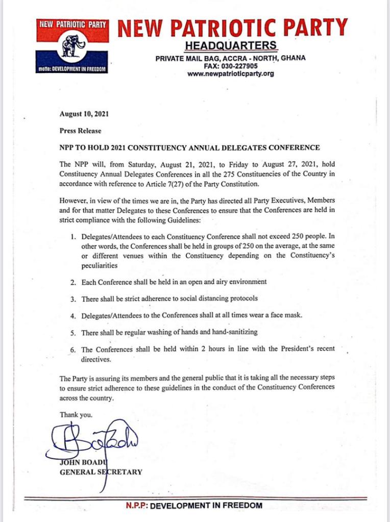 “The Party is assuring its members and the general public that it is talking all the necessary steps to ensure strict adherence to these guidelines in the conduct of the Constituency Conferences across the country,” the letter stated.