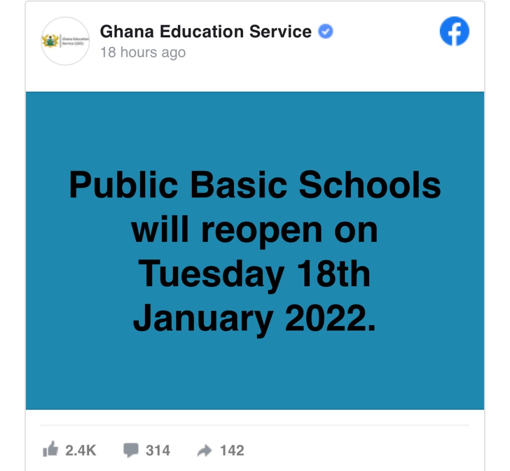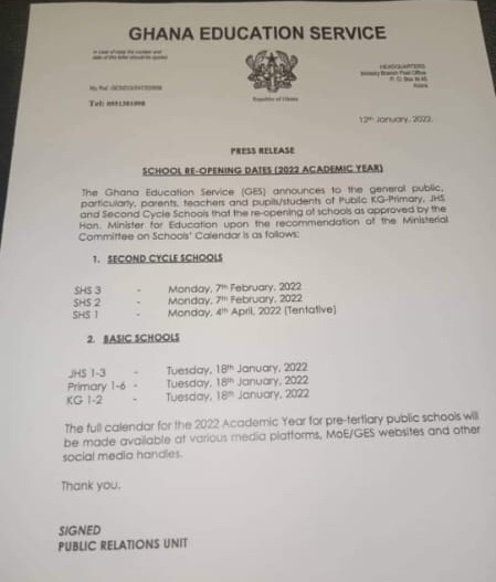The Ghana Education Service (GES) has announced the resuming date of all Public Basic Schools in the country. The reopening date has been set to Tuesday, 18th January, 2022.